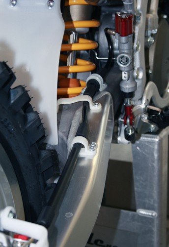 Our braided steel rear line dissipates more heat than the stock plastic line and the pedal travels less providing a firmer, more positive feel.