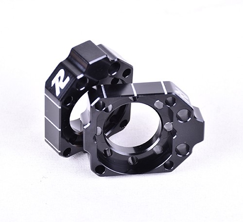 This all new design is 3.5 or 12.5mm longer than the stock blocks depending on which way they are placed in the swingarm. Precision machined for a better swingarm fit which reduces rocking for more accurate chain alignment. Keeps the adjustment bolts less extended. Each block has 3 adjustment lines per side. Anodized Jet black.