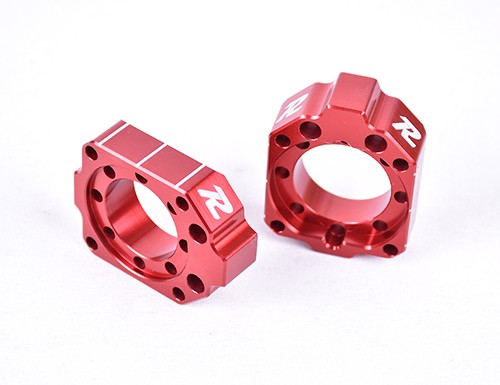 This all new design is 3.5 or 12.5mm longer than the stock blocks depending on which way they are placed in the swingarm. Precision machined for a better swingarm fit which reduces rocking for more accurate chain alignment. Keeps the adjustment bolts less extended. Each block has 3 adjustment lines per side. Anodized RED.