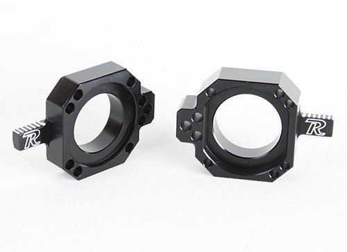 Precision machined for a better swingarm fit and more accurate chain alignment (Reduces "rocking"). Unique design allows easy chain alignment with tabs that have markings that can be easily seen and measured off the end of the swingarm. Blocks are 2mm shorter than stock for more gearing options. Our unique designs utilizes a CRF450 axle (P.N.: MX-AXL25-KT - required) allowing the left axle block to float similar to the Japanese design (a concept developed by Ryan Dungey and the KTM factory motorcross team) with claimed advantages of better tire traction and more straight line stability in whoops.